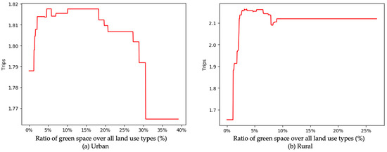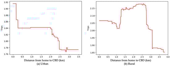 For older urban adults, the distance from home to the CBD is negatively associated with bus use (Figure 7a). The number of daily bus trips first drops sharply with increasing distance ranging from 0 to 0.25 km. Afterward, it flattens with slight fluctuations when the distance grows from 0.25 to 2 km. Beyond this range, bus use further declines gradually. In rural areas, the number of daily bus trips drops slightly when the distance from home to the CBD rises from 0.04 to 1.25 km (Figure 7b). Then bus use among older rural adults experiences a subtle increase when the distance is beyond 1.25 km. Once the distance is beyond a threshold of 2.73 km, bus use decreases sharply.