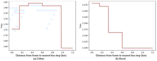 In urban areas, when the distance from home to the nearest bus stop is within the effective range of 0.18 to 1.0 km, bus use remains at a high level and peaks at approximately 0.32 to 0.6 km (Figure 8a). When the distance is shorter than 0.2 km or longer than 1.0 km, the effect on bus use is limited. Figure 8b illustrates that the distance from home to the nearest bus stop is negatively correlated with the number of daily bus trips of older rural adults. Bus use declines stably when the distance changes from 0.15 to 0.6 km. Following that, bus use remains flat.