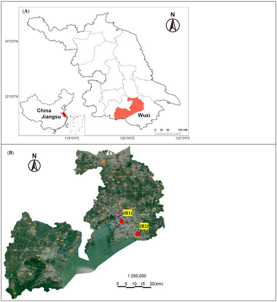 Location of the study area: (A) The location of Wuxi in Jiangsu Province, China. (B) Topographic map of Wuxi, Jiangsu Province. Source: National boundaries as per the Department of Natural Resources of China, background map. For details as per the open-source data available through BIGEMAP, visit http://www.bigemap.com (accessed on 25 July 2023). B1 is the study site, Oudian neighborhood (West); B2 is the study site, Zhenfa neighborhood.