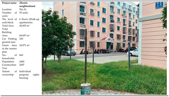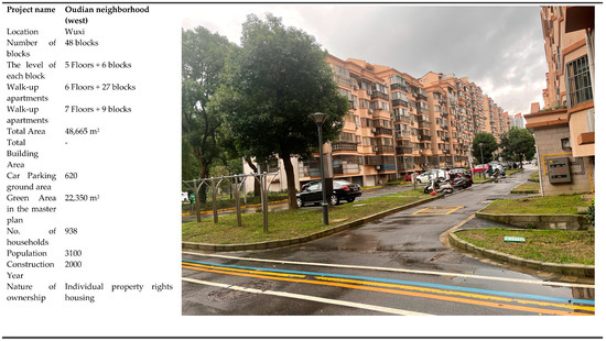 This study focuses on old residential communities within the Xin Wu District of Wuxi City. Adhering to the concept of “age-friendly”, the study aims to address the needs of both the elderly and children. These neighborhoods meet the policy requirements for neighborhood improvement in Wuxi City and are included in the first batch of neighborhoods to be improved. Due to their representative characteristics of old residential neighborhoods, which include significant infrastructural wear, outdated facilities, and a pressing need for renovation, these neighborhoods exemplify typical old residential areas with varied housing conditions and demographic diversity, providing a comprehensive data set for analysis. Recent improvement projects in these neighborhoods allow for a practical context to apply post-occupancy evaluation methods, assessing the effectiveness of renovations and identifying remaining needs. Additionally, the availability of reliable data, local support from municipal authorities, and alignment with Wuxi’s urban development initiatives facilitate a robust study. This choice ensures that the findings are generalizable to similar urban contexts, enhancing the study’s relevance and potential impact on broader urban planning and policy-making efforts. Consequently, the renovation of these old communities involves improving building quality, eliminating safety hazards, ensuring the safe operation of infrastructure, optimizing landscaping, and enhancing traffic organization and parking facilities. These residential communities, which were built in the 1990s, are characterized by dilapidated buildings, a lack of green infrastructure, insufficient space, and a higher proportion of vulnerable groups such as the elderly and low-income populations. Therefore, following a selection process, two residential communities, the Oudian Neighborhood (west) and the Zhenfa Neighborhood, were included in the study (Figure 2 and Figure 3). The preliminary survey data provided a summary of the construction period, number of households, building types, and community features of these two neighborhoods (Figure 2 and Figure 3). For more neighborhood information, please refer to Supplementary Materials.