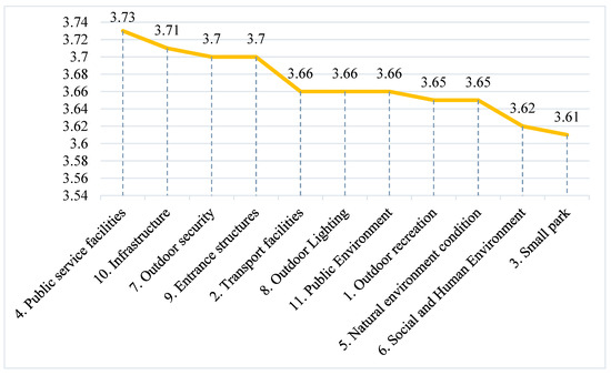 With the highest eigenvalue and percentage variance, outdoor recreation emerged as the most crucial factor influencing resident satisfaction. The creation of spaces for various recreational activities such as playing, resting, and jogging underscores the importance of active and passive recreational opportunities in enhancing the quality of life [58,59,60]. These recreational areas not only provide physical health benefits but also contribute to mental well-being by offering residents a chance to unwind and connect with nature [60,61]. The availability of such spaces facilitates social interactions, fosters community cohesion, and provides a sense of place and belonging, all of which are integral to overall life satisfaction.