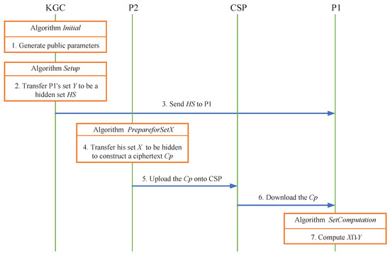 The proposed 2-way handshake O-PSI method consists of 4 algorithms, illustrated in Figure 3. KGC acts as a trusted authority for authorization. The server is a semitrusted party responsible for storing and providing online access services. P1 seeks to determine the intersection of their set and P2’s set.
