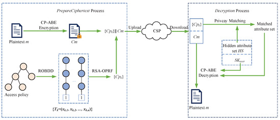 Let us look at the overall framework of the CP-ABE-FPH scheme. An owner generates a plaintext m, defines a tree-type access policy for the m, and encrypts it to be using a CP-ABE method. Meanwhile, the owner transforms the tree-type access policy to be many attribute sets, called feasible paths . Next, the feasible paths are encrypted to be based on RSA-OPRF. In the final, and are concatenated and uploaded to the cloud. On the user side, a user downloads and . The user first tries to match their attribute set with . If their attribute set satisfies any in , they do not try using their attributes one by one and decrypt to be m directly.