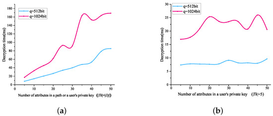 Figure 7a,b shows that the decrypt time is independent of the number of attributes in a user’s private key and naturally increases with the number of attributes in when q = 512 bit. The difference between Figure 7a,b is that and grow synchronously in Figure 7a, while Figure 7b fixes to be 5 and is growing. But even with a large attribute set (e.g., = = 50), Figure 7a shows that the decryption operations can still be completed within tens of milliseconds when q = 512 bit.