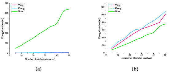 Figure 8a,b compares the proposed CP-ABE-FPH scheme with Zhang et al. [2] and Yang et al. [7] when q = 512 bit. To simplify, k is assumed to be 1 in Zhang et al. [2], and the number of attributes in the access structure is the same as the number of attributes in the user’s private key in all schemes. The results show that the proposed CP-ABE-FPH scheme has low efficiency in encryption. This is because the CP-ABE-FPH scheme involves two successive steps (ROBDD and RSA-ORPF) in encryption compared with other schemes. The encryption time can be reduced by calculating and storing the in advance. In this way, the encryption time is small and becomes constant. The results also show that the proposed CP-ABE-FPH scheme is highly efficient in decryption. This is because the CP-ABE-FPH scheme requires only two pairing operations for decryption, and pairing operations are notoriously time-consuming.