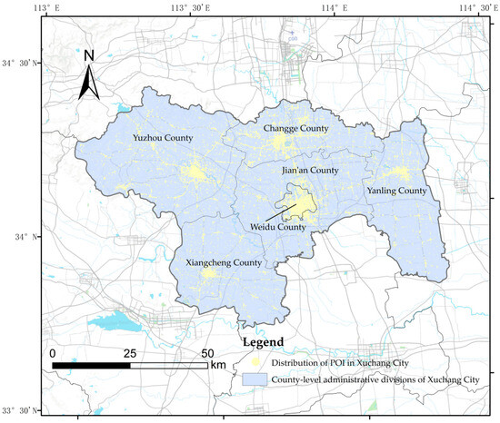 To calculate the comprehensive weight of POIs, auxiliary data from the 2018 vector dataset on Xuchang urban construction land classification were employed. The validity of these data extends over the subsequent decade. This dataset provides information on primary land type, secondary land type, longitude, latitude, footprint, and other attributes [46].