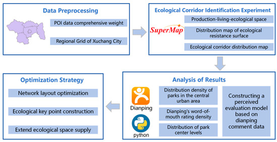The research framework of this study is divided into four stages: data preprocessing, an ecological corridor identification experiment, results analysis, and an optimization strategy, as shown in Figure 2. Initially, the study establishes a comprehensive POI data weight table based on POI data using the Analytic Hierarchy Process (AHP). Subsequently, it utilizes the minimum cumulative resistance model and the gravity model to successively obtain the spatial distribution maps of three types of habitats, an ecological resistance surface distribution map, and an ecological corridor distribution map. Following this, spatial distribution kernel density analysis, public opinion score kernel density analysis, and center level distribution analysis were conducted on the green parks that were identified in ecological corridors in the central urban area. Based on Dianping review data, a perceptual evaluation model was constructed for urban parks passing through ecological corridors and sentiment analysis was conducted. Finally, the study proposes optimization strategies based on the analysis results.