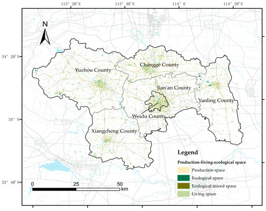 Spatial distribution map of production–living–ecological space in Xuchang City.