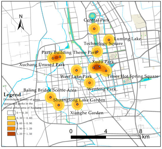Kernel density distribution of green parks in the central city of Xuchang.
