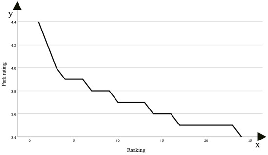 Based on the word-of-mouth scores and corresponding rankings of Xuchang parks on Dianping, we generated a curve chart in SPSS Pro software depicting the rankings of parks (Figure 7). From the data of a few parks with high word-of-mouth scores, it is evident that only a few green parks in Xuchang meet the high standards of the public, with the majority of Xuchang green parks scoring in the middle-to-low range.