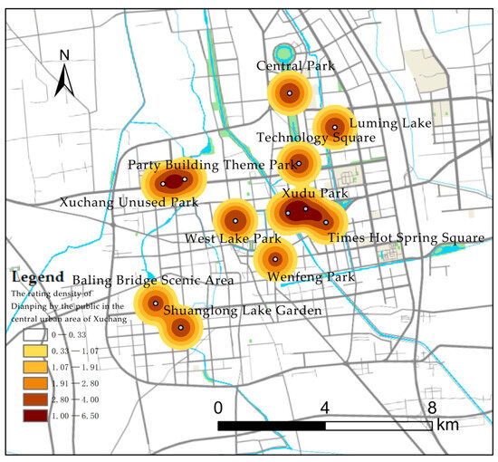 To further support the identification results of the ecological corridors in the central urban area and propose corresponding optimization strategies, this study employs public reviews from the Internet to obtain scoring data for all parks in Weidu District. These scores were correlated with the spatial distribution of the parks [56]. Next, we conduct distribution kernel density analysis and Dianping word-of-mouth scores distribution kernel density analysis on the urban parks through which the urban ecological corridors pass. Finally, based on the above analysis results, a distribution analysis of the central grades of the urban parks is conducted.