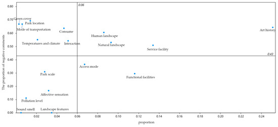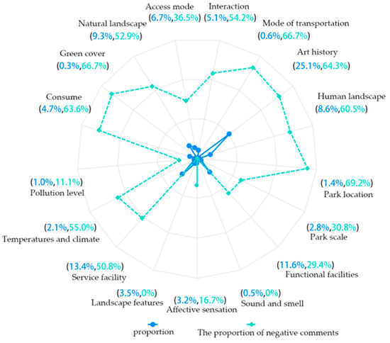 Based on the sentiment analysis, the proportion of comments pertaining to the category of human history is the highest, indicating that citizens are more prone to evaluating urban parks’ cultural and historical environments. Negative comments regarding city park service facilities, park location, interaction, transportation, greening, temperature, cultural landscape, cultural history, consumption, and natural landscape collectively constitute more than 50% of the total number of comments. Among these, the top three categories with the highest proportion of negative comments are park location, green coverage, and modes of transport. Optimization strategies can be formulated by considering the specific content of related comments.