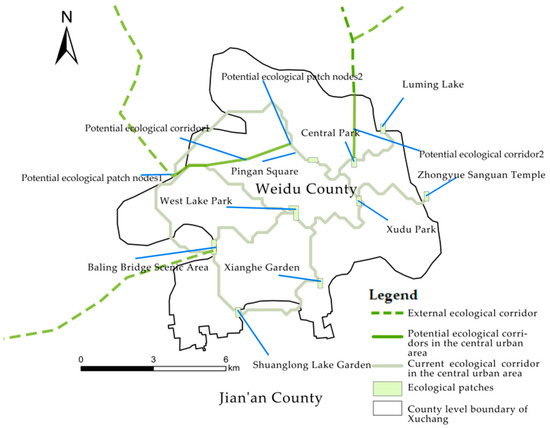 In future urban ecological network construction, it is imperative to strengthen connections between the central urban area and the surrounding urban regions. Three outward-extending ecological corridors in the central urban area can be developed: (1) potential ecological corridor 1, extending to Yuzhou City and Changge City; (2) potential ecological corridor 2, extending from Furong Lake in the north of Central Park in Weidu District to Beihai Park in Jianan District and Flower Expo Park in Yanling County; and (3) Baling Bridge Scenic Spot in Weidu District to Ziyun Mountain Scenic Spot in Xiangcheng County. These developments will establish three district-level ecological corridors, as illustrated in Figure 12. By strategically placing public facilities along these ecological corridors, connections between counties and cities will be bolstered, enabling cross-regional linkages across various ecological patches. This will regulate the urban climate, mitigate the urban heat island effect, and enhance regional ecological benefits.