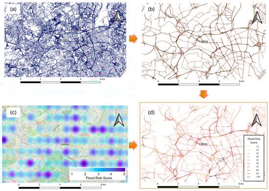 Data flow for flood hazard mapping of road networks. (a) OSM raw road map; (b) Clean main road map; (c) Flood Hazard Map from Previous Study; (d) Road network flood risk score from This Study Result.