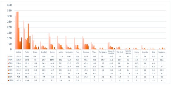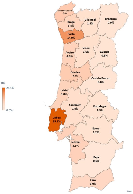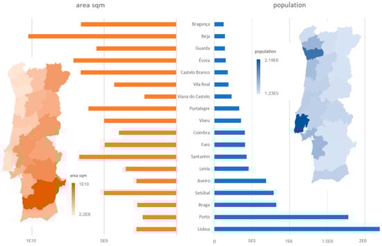 Figure 4 shows that urban districts like Lisbon and Porto have a lot of people living in relatively small areas. In the graph, the blue bars (representing population) are much taller than the orange bars (representing land area) for these cities [77]. This is probably because these areas have many jobs, services, and facilities, which attract people looking for work and a better quality of life.