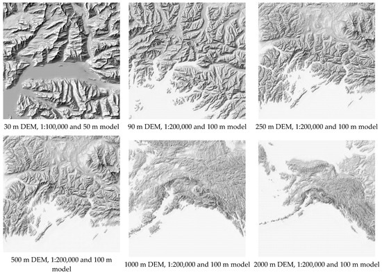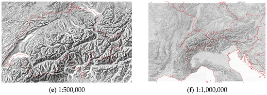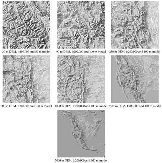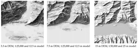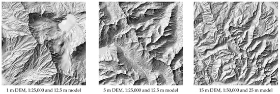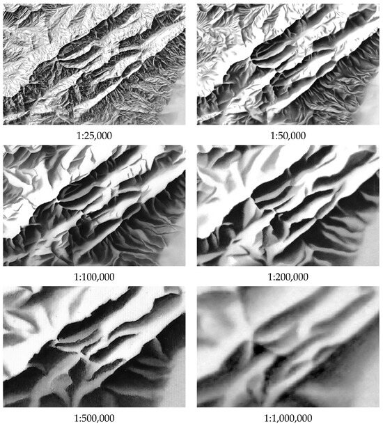 Not only the technical improvements like computers and software advancements fostered the rapid development of analytical relief shading, but also the widespread use and employment of raster DEMs [3]. The size of the cells, or DEM resolution, influences the relief shading appearance [4]. Over time, the resolution of DEMs was constantly increased, and multi-resolution sets were developed and collected for some mountain areas [5]. Detailed and accurate data are crucial for large-scale mapping, but when it comes to small-scale depictions of extended mountain areas and large terrain features, cartographers prefer to emphasise them and reduce noise, which would require less detail and lower-resolution data [4]. Figure 1 demonstrates the stepwise removal of detail scale by scale inspired by Eduard Imhof’s example of the Säntis group in the northeastern part of Switzerland [1]. While the most detailed shading at 1:25,000 requires very precise input data, it proves the importance of considering resolution when generating shaded relief at a specific scale. Therefore, this research focuses on finding out which DEM resolution is appropriate to use for a specific output scale with the help of machine learning. It should result in guidelines on a DEM resolution and scale choice.