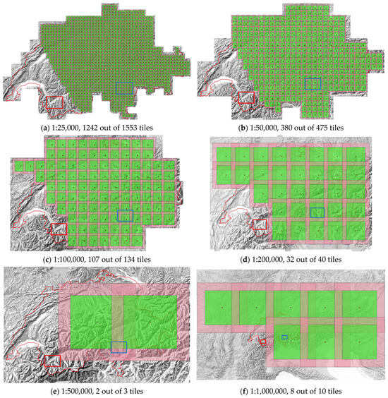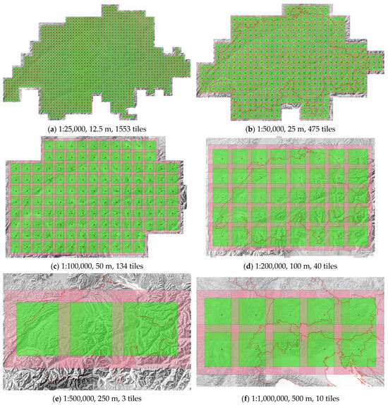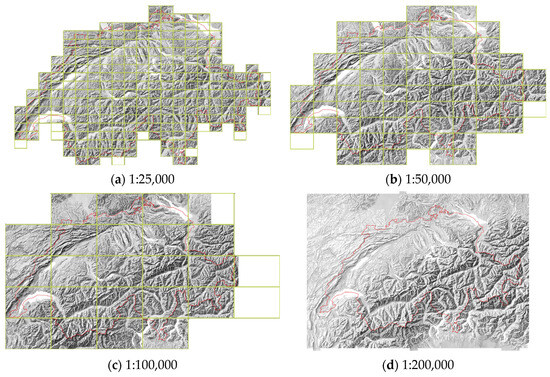 The 1:25,000 manual relief shading contains 259 tiles (Figure 2) and has an original (scanning) resolution of 1.25 m, the 1:50,000 shading has 80 tiles and 5 m resolution, the 1:100,000 shading has 25 tiles and 10 m resolution, and at the scales 1:200,000, 1:500,000, 1:1,000,000, there are single raster files with resolutions of 20 m, 50 m and 100 m, respectively. As one can see from Figure 2, the extent of the data for training varies depending on the scale, from just covering the territory of Switzerland to offering more area outside the Swiss border within a polygon. The manual shading at 1:1,000,000 offers a much larger extent covering neighbouring territories.