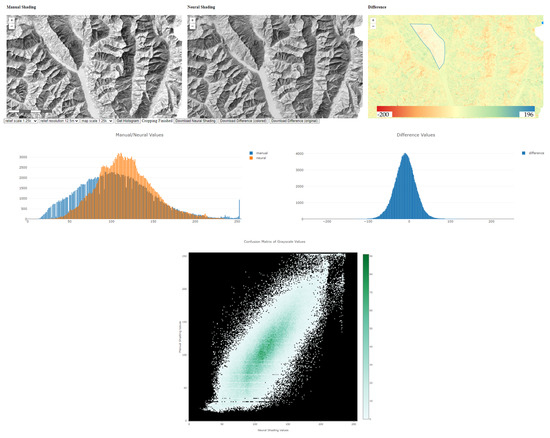 We designed a web application that should help users explore the manual and neural relief shadings and compare them when placed next to each other (Figure 5). It displays the swisstopo manual relief shadings, already generated predictions according to Table 3 for the area of Switzerland, and their difference images. In addition, it allows for outlining an area, for instance, an illuminated or a shadowed slope, downloading the cropped raster files, showing overlaid histograms of varying brightness between manual and neural shadings and of their difference values, and delivering confusion matrices for the outlined areas presented as a sort of heat map. This interactive tool can be found and tested at www.reliefshading.ethz.ch (accessed on 3 September 2024).