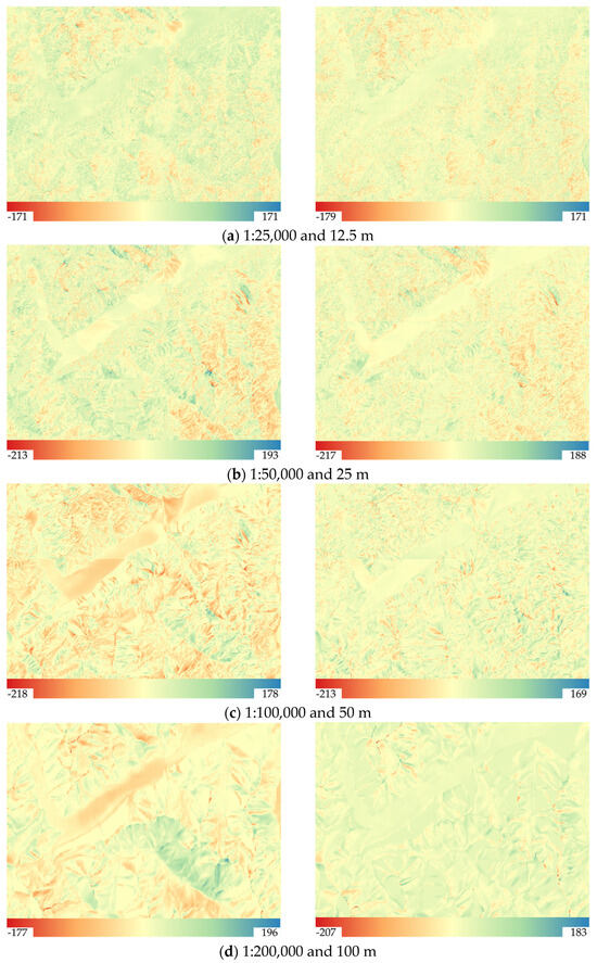 Neural relief shadings trained with 80% of the points (left) and 100% of the points (right) subtracted from the manual relief shadings with the minimum and maximum tonal difference values for that specific area at (a) 1:25,000 and 12.5 m resolution, (b) 1:50,000 and 25 m resolution, (c) 1:100,000 and 50 m resolution, and (d) 1:200,000 and 100 m resolution.