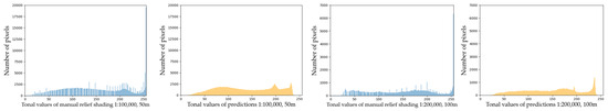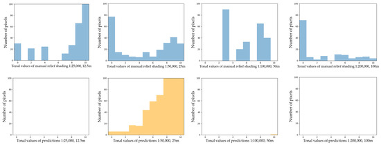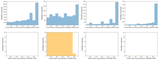 Second, the prediction distribution curves tend to repeat those of manual shadings in most of the cases, but they appear shifted towards the middle tones and are shorter in length, excluding the brightest and the darkest values. By adjusting the range of pixel numbers, we can see if black and white values are present on manual relief shadings and predictions at the corresponding scales (Figure 7 and Figure 8).
