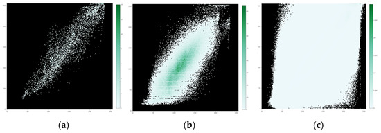 Confusion matrices of grey values as heat maps with manual values in the x-axis and neural values in the y-axis: (a) a slope, (b) a larger area, and (c) the whole of Switzerland at 1:25,000 and 12.5 m resolution.