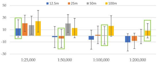 The lower the absolute mean values, the closer the tonal values of the predictions to those of manual relief shadings. Tonal values on manual shadings do not depict the absolute heights, but “the approximate appearance of differences in relative elevation” [1]. Thus, it is not the absolute measure to refer to, but in our research comparing the predicted shadings to manual ones helps us to see whether there is a correlation between scale and resolution, since manual relief shadings present a historically important and carefully considered level of detail for a certain scale. As we can see, at scales of 1:25,000 and 1:100,000 (Figure 11) and 1:25,000 and 1:50,000 (Figure 12), the lowest absolute mean values are those of the resolutions 12.5 m and 100 m and 12.5 m and 25 m (the numbers closest to zero for each of the scales). The negative values here only guide us on which side (darker or lighter) the mean values are, and what we look at is how close the value is to zero. For smaller scales, the 50 m (Figure 11) and 25 m resolutions (Figure 12) show the values closest to zero, while 50 m and 100 m resolutions give the second-best values (Figure 12). Here, the difference between the quantities of training data is not high; the main distinction is about the consistency of values. Overall, there is a tendency of ascending mean values for each of the resolutions within one scale, which fits the scale/resolution ratios from Table 1. There are outliers, e.g., the highest values of 50 m resolution for the 1:50,000 scale (Figure 11) or the 12.5 m resolution for the 1:200,000 scale (Figure 12) and the second-best values for certain scales and resolutions, and given that every single model gives a slightly different prediction, we may assume that further models would give a potentially better and more consequent picture. For some scales, mean values are not the closest to zero for best-fit resolutions but are still much lower than the least-fit ones.