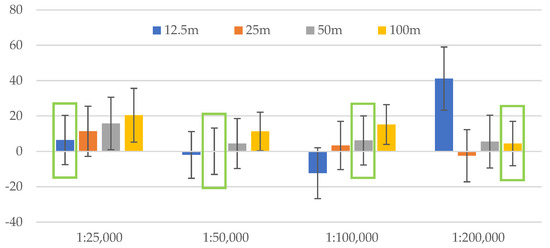 Mean and standard deviation values plotted against different resolutions for each of the scales (100% of the training points) with the bars outlined in green according to Table 1.
