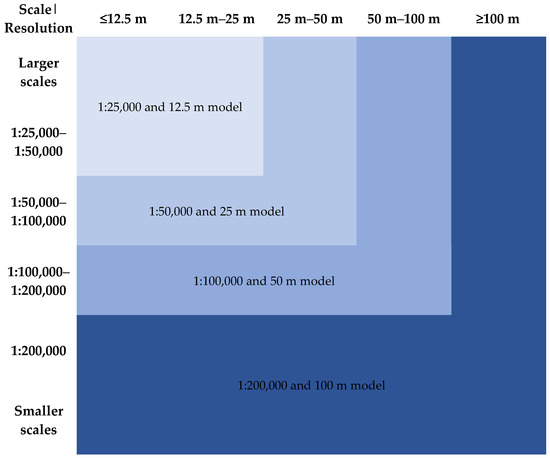 - Model 1:25,000 and 12.5 m: for scales < 1:25,000–1:50,000 and/or resolutions < 25 m;