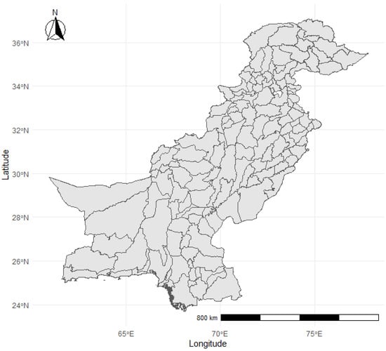 This study covered all 145 districts from all provinces (Punjab, Sindh, Kpk, Gilgit-Baltistan), excluding ICT (Islamabad Capital Territory represented as white region), made available in the form of shapefiles. All districts were included in the analysis. Districts were mapped using shapefiles of Pakistan from DIV-GIS. All computations and estimations were performed in R Studio. The following Figure 1 is the official map of Pakistan portraying all the districts covered.