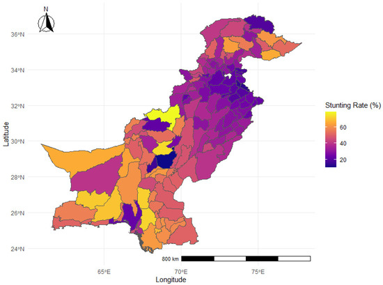 The current study highlights the spatial dependence in childhood stunting across districts in Pakistan. Out of 144 districts examined, 46 exhibited childhood stunting rates exceeding 50%. Notably, the majority of these districts are clustered in southern Punjab Province, northern Kashmir and northwest Khyber Pakhtunkhwa. In contrast, regions in central Pakistan and Gilgit-Baltistan Province have low rates of childhood stunting.