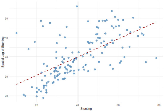 Figure 4 illustrates the same thing as a scatter plot. It shows districts in green colour with low values surrounded by similar districts (low–low regions), light shaded districts possessing higher stunting rates and surrounded by similar districts (high–high regions) and in between a few outliers (low–high regions).