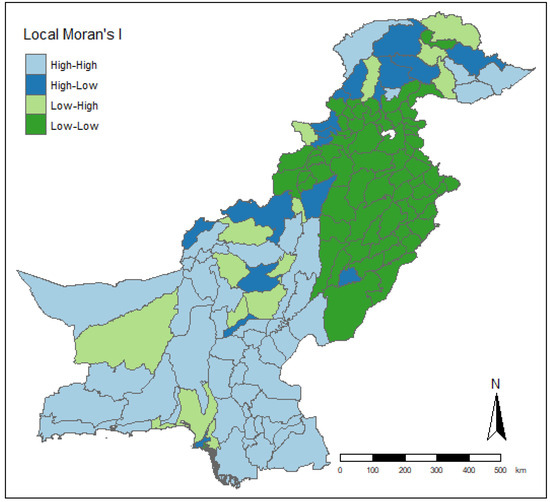 The computation of Moran’s statistic is based on the famous spatial weights matrix. in the above equation signifies the spatial weights matrix. Moran’s value is in the range [−1, 1]. A positive value reveals a positive spatial autocorrelation and vice versa. A positive value suggests that districts exhibit similar values to their neighbours. Furthermore, Moran’s scatter plot was generated, which is composed of four quadrants: Hotspots (regions with high values next to each other), Cold spots (regions with low values next to each other) and Spatial outliers (districts with high and low values next to each other and vice versa) [25,26].