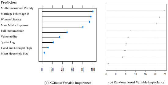 In this study, the outcome variable was the percentage of stunted children under the age of five, defined by MICS as children whose height-for-age z-scores were below minus two standard deviations. Independent features were obtained from three different sources. Socioeconomic features, including female literacy, meaning the percentage of women who can read a short simple statement and also attended secondary school education; premature birth rate, representing the percentage of all children who were born before 37 weeks of pregnancy; marriage before age 15, showing the percentage of women who got married before reaching the age of 15; multidimensional poverty (MDP), entailing people of all age groups living in poverty; women’s exposure to mass media, meaning the percentage of women who read a newspaper or watch any sort of electronic media at least once per week; and full immunization, meaning the percentage of vaccinated children, were retrieved from MICS 2018. All the abovementioned features were aggregated as percentages. Additionally, district-level climate vulnerability was retrieved from Integrated Contextual Analysis [24]. Climate vulnerability includes two primary hazards: (1) floods and (2) droughts. Flood hazard data were retrieved from the National Disaster Management Authority (NDMA). It reflects the total number of recorded flood events from 1950–2015. Drought data, obtained from the Pakistan Meteorological Department, are based on multiple factors such as soil moisture, precipitation, dependency on seasonal rainfall and drought frequency (based on Standardized Precipitation Index). All districts were categorized into a three-point scale—low, medium and high—according to their vulnerability to floods and droughts (https://reliefweb.int/report/pakistan/integrated-context-analysis-ica-vulnerability-food-insecurity-and-natural-hazards, (accessed on 10 November 2023)). Climate vulnerability was classified into three levels: low, medium and high. Each district was assigned a vulnerability classification based on its exposure to climate change.