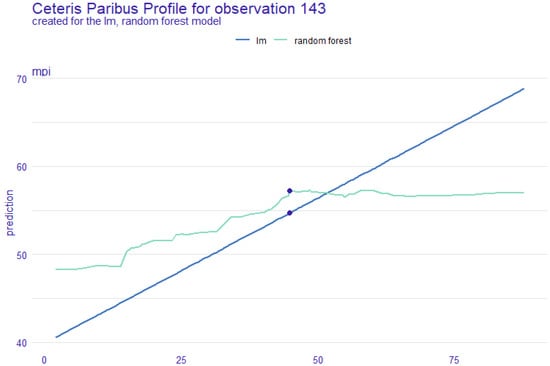 Figure 6 below exhibits a partial dependency plot that indicates the existence of a nonlinear relationship between multidimensional poverty and childhood stunting, as identified by EXAI Random Forest. However, the ordinary least square regression shows a perfect linear relationship to represent the predicted value of childhood stunting for a random observation. It clearly shows that OLS predicts an approximate value of 54, while EXAI suggests the predicted value to be 57.23 (the real value was 60). This further shows the predictive performance of ML algorithms in comparison to traditional OLS regression.