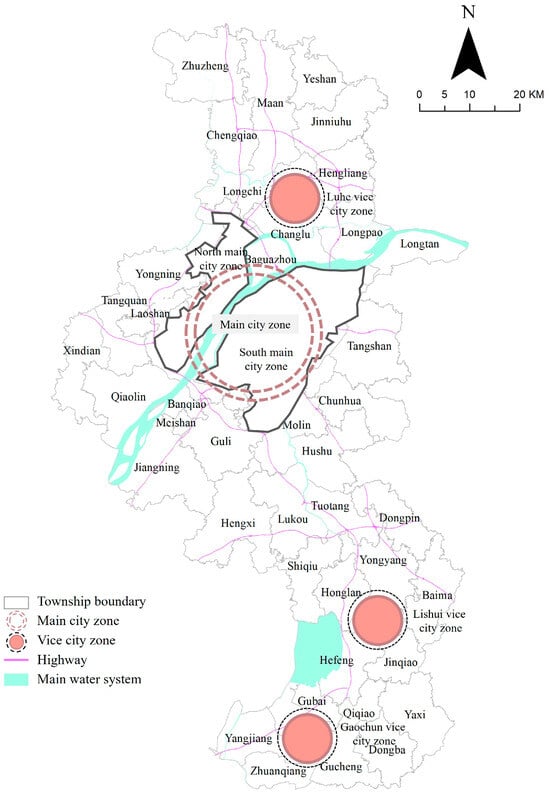 Nanjing, a central city in the Yangtze River Delta and the core city of the Nanjing metropolitan area aims to achieve cross-river development and a multi-center structure as its spatial organization goals. With the construction of the Jiangbei New Area as a national strategy in 2015, Nanjing’s spatial development pattern has been planned to form “one main city, one new city, three sub-cities, and one river with two sides” (Figure 1). The entire city is divided into two major sections by the Yangtze River: Jiangnan (south of the river) and Jiangbei (north of the river). Jiangnan main city and Jiangbei new main city constitute the central urban area, which is the primary bearer of Nanjing’s central city functions. According to the “Nanjing Metropolitan Area Development Plan” released in 2021, the next phase of Nanjing’s intra-urban spatial structure will expand east–west along the Yangtze River to radiate and drive the surrounding cities.