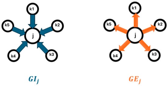 In Equations (2) and (3), (gross immigration) is the net population inflow value of node j, representing the weighted sum when the net inflow value of the nodes connected to it is positive, which can be considered as the weighted in-degree. (gross emigration) is the net population outflow value of node j, representing the weighted sum when the net outflow value of the nodes connected to it is positive, which can be considered as the weighted out-degree. K is the total number of cities associated with city j. Figure 2 shows a direct difference between and . In Equation (4), represents the net population flow between two locations, and indicates the population agglomeration from k to j, multiplied by the logarithm of the node’s net population inflow value using e as the base, resulting in the positive factor of the node’s directed alternative centrality. represents the population dispersal from j to k, multiplied by the logarithm of the node’s net outflow value using e as the base, resulting in the negative factor of the node’s directed alternative centrality. The DAC value of a node is obtained by summing the positive and negative factors. Equation (5) calculates the DAP value of a node, which is the path where the net migration into node j is positive, indicating the degree to which it “deprives” other nodes of the population. The higher the value, the stronger its control over the hinterland. According to Zachary’s paper, we use Figure 3 to illustrate the concepts of DAC and DAP, highlighting the difference between centrality and power. In Figure 3, City j1 is more central but not particularly powerful, while City j2 is powerful but not particularly central.