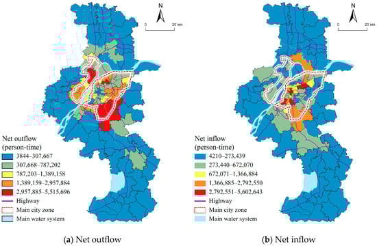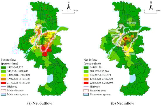 In the context of a directed weighted network, the population net inflow and outflow values for each node in both the employment flow and recreational flow networks are statistically summarized to explore the aggregation and diffusion processes of different types of population flows. In the employment flow network, as shown in Figure 4a, the net outflow of the population exhibits a concentric ring structure, gradually increasing from the central urban areas to the peripheral urban areas. On the other hand, as shown in Figure 4b, the spatial distribution of the net inflow population presents a structural characteristic of point-like and belt-like distributions. High net outflow areas are “encircled” along the outer ring highway, while high net inflow areas are “leapfrogged” between the central urban area and the inner ring highway. This pattern reflects, to some extent, the importance of high-grade roads for industrial aggregation and employment clustering.
