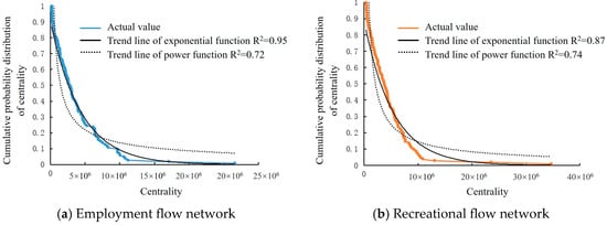 By extracting the population mobility network matrix and edges that exceed the average network value, based on the connection strength of bidirectional network edges, the network structure can be visualized using natural breaks classification in GIS. As shown in Figure 6, the network structures of employment and tourism flows are similar, with major population flows occurring in Jiangnan main city and surrounding areas, mostly between neighboring towns and streets. In terms of the quantity characteristics of population mobility, as shown in Table 1, the standard deviation is significantly greater than the average value, indicating that the population mobility between townships and streets is relatively dispersed, uneven in distribution, and positively skewed. A skewness coefficient greater than 0 indicates a high concentration of population flows in a few townships and streets. For example, the top 1% of nodes in the employment flow network contribute 22.36% of the total flow, the top 2% contribute 31.96%, and the top 10% contribute 66.48%. Further analysis of the cumulative distribution of node-weighted degree indicates a power-law distribution, as shown in Figure 7. Taking the employment network as an example, its node degree distribution function is and , while its index distribution function is and , which indicates a weak scale-free feature. Stronger scale-free features have been discovered in population migration networks at the national [4] and urban agglomeration scales [49]. The weak scaling findings in this article indicate that for urban residents, daily travel is still mainly based on proximity, and there is little long-distance travel for relocation and business exchanges. In general, in the employment and recreational flow networks of Nanjing, high-degree nodes tend to connect with low-degree nodes at a relatively slow rate, with many mid-degree nodes acting as intermediaries. This also reflects the daily travel patterns of urban residents who choose optimal destinations within a certain distance. Both types of networks are still some distance away from having the globally optimal characteristics of scale-free networks, suggesting the need for efficient measures in urban planning to improve transportation and functional facilities accordingly.