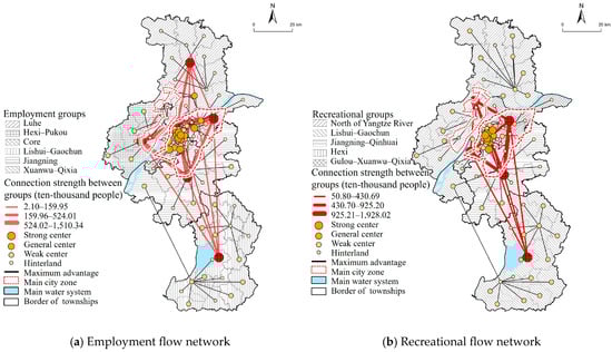 Utilizing a community detection algorithm, the clusters within the population mobility network are extracted. Based on this, nodes within each cluster are ranked according to their DAC values using the natural breaks method, categorizing them into four tiers: primary centers, secondary centers, weak centers, and hinterlands (Figure 8), providing a comprehensive view of the functional center system across Nanjing. For the employment flow, the community detection algorithm reaches the highest modularity index of 0.349 at a resolution of 1, forming six employment clusters with the most stable partitioning effect. As shown in Figure 8a, under this partitioning, the trend of cross-river integration of employment functions has initially emerged, with a central cluster of cross-river development appearing. The Hexi area (a newly developed urban area in Jiangnan that Nanjing is striving to build, mainly featuring financial, commercial, and high-end residential functions) has formed close cross-river connections with the vast majority of the Jiangbei area. Additionally, Lishui and Gaochun districts in the south are connected to form a unified employment cluster, while Jiangning and Luhe districts, two important manufacturing hubs in Nanjing, form relatively independent employment clusters. Overall, the spatial distribution of employment centers is relatively concentrated.