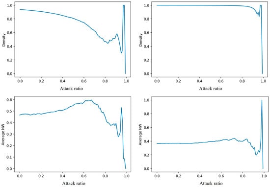 Density is a fundamental indicator reflecting the level of network development and the resilience of the network. The initial network density values for employment and recreational flows are almost identical: over 90% of the townships and streets have connections related to employment and recreational flows (Table 2). This density value significantly exceeds the population mobility network density at the Nanjing metropolitan area scale (around 70%). As shown in Figure 9a, after sequentially attacking the network based on the ranking of node centrality values, the network density of employment flows shows a linear decline until a turning point occurs when the attack proportion reaches 60%, after which the density reduction accelerates. This indicates that nodes with a weighted centrality value ranking around 60% are crucial for maintaining a relatively dense employment flow network. In contrast, the change in network density for recreational flows remains stable, maintaining a high-level density value even after high-value nodes fail (Figure 9b), reflecting that the formation and development of the recreational flow network rely on all nodes rather than specific nodes. This echoes the findings of Niu et al. (2014) [51] in Shanghai, who found that holiday travel has significant randomness and spatiotemporal flexibility, including a greater utilization of public service and recreational facilities. Leisure facilities are much more dispersed in their provision compared to employment positions. Whether it is the employment flow or the leisure flow, their density has not shown strong fluctuations under attacks, while Guo et al.’s (2022) research on high-speed rail networks found that if the first 48% of nodes are attacked, the density change amplitude is more than double [20]. This indicates that population mobility connections are more evenly distributed than high-speed rail connections.