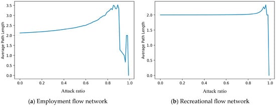 Network transmissibility reflects the efficiency of population flow. The transmissibility values of the employment flow network and the recreational flow network are relatively close and both at low levels (Table 2). Taking employment flow as an example, in the case of a complete network, its average shortest path length is 2.12 (Table 2), meaning that the employment population flow requires transit through more than two nodes, a value close to that of the enterprise network transmissibility based on offshore A-share listed companies and their subsidiaries [52]. However, unlike the sparse enterprise network with limited nodes and edges that suppress the efficiency of element flow, Nanjing’s population mobility network has a considerable scale of nodes and edges. The low transmissibility is due to the fact that whether for employment or recreation, population flows are still concentrated in localized areas, and long-distance movement is not frequent, with remote nodes needing to connect to the intra-urban network through “bridges”. Once high-value nodes are attacked, the average path length of the employment flow network rises rapidly (Figure 9a), reflecting the crucial “bridge” role of high-value nodes in the flow and transit of employment population, as more low-value nodes choose to organize long-distance connections through high-value nodes. Similar to the trends in the previous two resilience values, the recreational flow network shows robustness against attacks, with transmissibility almost unaffected (Figure 9b). The mutation point occurs at 85% of the nodes (Figure 9b), which correlates with the performance of the recreational flow network in terms of density and symmetry, indicating that the top 85% of the nodes by degree value are the core network for maintaining the normal operation of the recreational flow network.