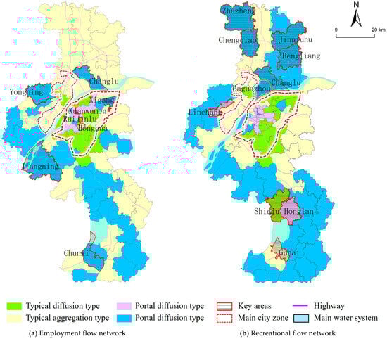 As shown in Figure 10a, in the employment flow network, the spatial distribution of key areas exhibits a concentric ring pattern of center–periphery. Apart from Chunxi in the south, the remaining townships and streets are concentrated in Jiangnan main urban area and the nearby suburbs around the central urban area. From the perspective of the network division of labor, key areas within the Jiangnan main urban area are mostly diffusion-type nodes, primarily residential in function. For example, Honghua Street is the location of the southern new city of Nanjing and the last large-scale increment space available for overall development within the main urban area. Key areas in the nearby suburbs are all portal-type aggregation nodes with multiple large industrial parks in their jurisdictions. For instance, Changlu Street is a hub for major chemical enterprises in Nanjing, Jiangning Street hosts the Nanjing Jiangning Binjiang Economic Development Zone with a cluster of equipment manufacturing enterprises, and Yongning Street has a rapidly developing modern agricultural industrial park. The residence–employment connections between residential spaces in the main urban area and industrial parks in the nearby suburbs are crucial for maintaining the normal operation of the employment flow network across the entire domain. In the recreational flow network (Figure 10b), key areas shift towards the distant suburbs and show a strong orientation towards highways. Notably, aside from Shiqiu and Gubai in the southern part of the city, the remaining key nodes are all aggregation nodes of population mobility. These include Jinniuhu, Zhuzheng, Linchang, etc., which have been focal points for the vigorous development of Nanjing’s rural tourism in recent years. Moreover, the key areas of the recreational flow network exhibit a contiguous distribution characteristic, reflecting the higher randomness and spatial spillover effects of recreational travel compared to employment travel.