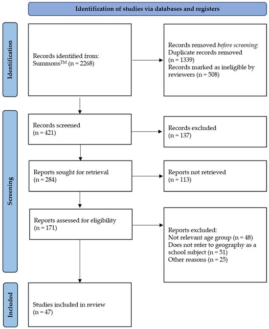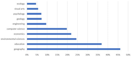 Three types of works were selected for the systematic review: journal articles and conference proceedings were selected as peer-reviewed works, and in addition to them, the dissertation/thesis category was also added as they also undergo a thorough filter when corrected and commented on by at least two opponents. The S4 results showed a great variety of works, which also allowed for preliminary observations that revealed interdisciplinary connections and highlighted specific subject terms. The search engine assigned the findings into 53 disciplinary categories, and each work was assigned to more than one discipline. Most of the records were listed under the disciplines of geography (46%) and education (37%), and the disciplines of environmental sciences, economics, and computer sciences each had a share of more than 20%. The wide variety and high proportion of disciplines imply that the topic under investigation requires a multidisciplinary approach (Figure 1).