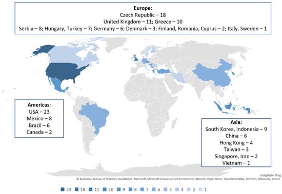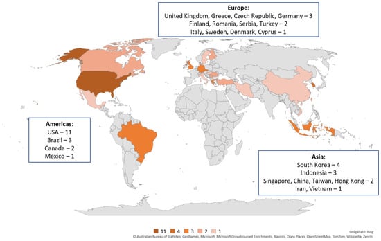 The total number of authors of the forty-seven reviewed works is one hundred fifty-three, representing twenty-five countries from three continents, with a quarter of the works originating in the USA. Only seven works are the results of international cooperation (Finland–Italy–Sweden—1, Iran–South Korea—1, South Korea–Singapore—1, Hong Kong–Taiwan—1, Denmark–USA—1, Indonesia–Vietnam—1, Canada–Finland-Germany–USA—1), the others are written by researchers from a single country. No works are found in Africa or Australia (Figure 3). The geographical distribution of the involvement of researchers (Figure 4) reflects a rather uneven coverage and suggests that the topic of the application of VR activities in geography teaching (K-12 levels) is rather under-researched.