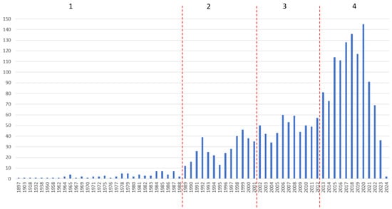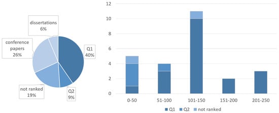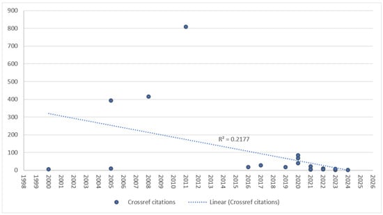 Data from Crossref also supported our findings with similar but somewhat lower values (60% less on average) than those provided by the ResearchGate website. The absolute values of the Crossref citations reveal two distinctive groups in terms of the impact of the time factor on the number of citations, with a higher concentration between 2005 and 2011 [,,] and a lower concentration after 2016 [,,,,,]. Unfortunately, no Q1 or Q2 publications could be selected for our review from 2012–2015; therefore, there is a gap in this respect (Figure 7).