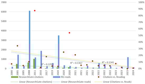 Altogether, 23 papers published in Q1 (19) and Q2 (4) journals are present only from the year 2000. Three major tendencies can be observed in analyzing data derived from ResearchGate with regard to the reading and citation characteristics (Figure 6).