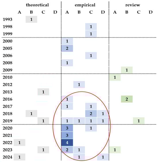 Frequency of research types by year (Legend: A—Q1/Q2 journals, B—not ranked journals, C—conference proceedings, D—dissertations. The shades of colours indicate the number of studies per year by study type: grey—theoretical, blue—empirical, green—review. The red circle marks the highest concentration of studies analysed in the review).