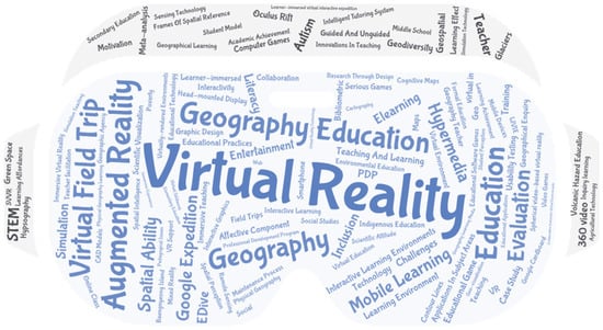 The 47 works use 179 keywords, of which 16 appear more than once; thus, the total number of different keywords used by the authors is 128. The most often occurring keyword is “virtual reality,” used in 24 works, followed by “augmented reality” with 6, “education” and “geography education” with 5 appearances, while “geography” and “virtual field trip” appear 4 times each. The words “geo” and “VR” are used only in two works, while there is one occurrence for “geography teacher,” “teaching geography,” “cartography,” “geographical learning,” “geospatial,” and “maps.” The rest of the keywords (112) either focused on areas related to geography (such as STEM, remote sensing, field trips, hypsography, etc.), technology (such as virtually-rendered environment, VR support, CAD models, mobile devices, etc.), or methodology (such as formal education, innovations in teaching, academic achievement, collaboration, etc.) (Figure 9).