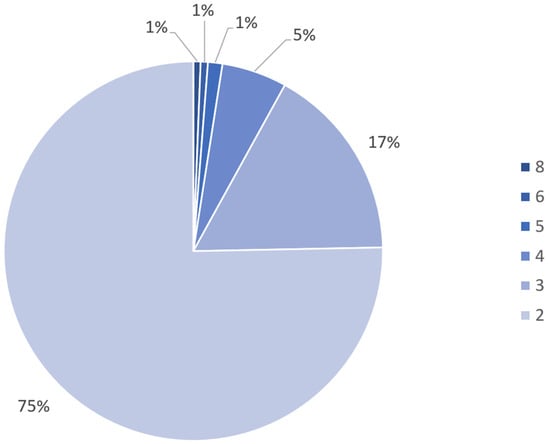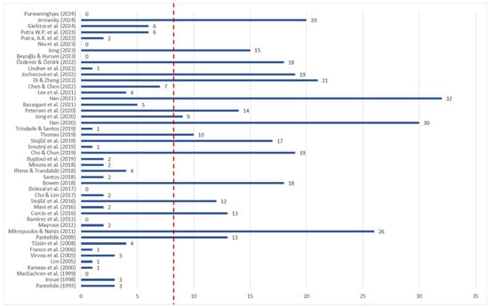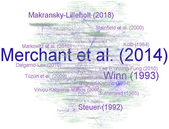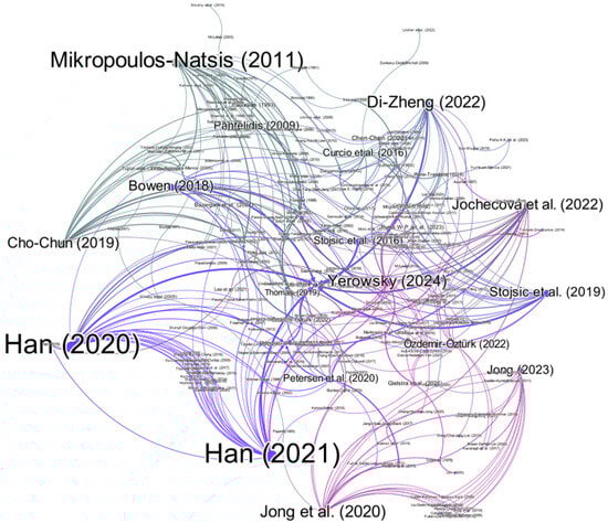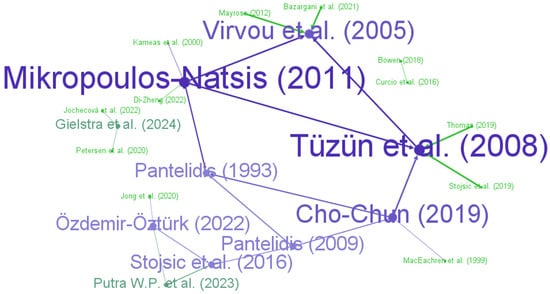 The number of reviewed works co-citing the same sources, at least in two cases, shows a great variety with no obvious limitations caused by the time factor. Han [,], Mikropoulos and Natzis [], Di and Zheng [], and Jerowsky [] have 20 or more citations in common with the other reviewed authors. While Han [,] belongs to those authors who cite works that are also cited by others, with approximately 50% of the works cited by him being cited in one or more works, Yerowsky has a list of references with over 300 items [], and thus proportionately that work has less in common with the other works. Six works use literature studies that are not found in any of the other reviewed works; thus, these seem to be isolated from the rest. Interestingly, the geographical origins of the authors of these six works show a great variety with no specific regions (United States [], Mexico [], Czechia [], Cyprus [], China [], and Indonesia []), while there is a concentration in time (two-thirds of the being published after 2020) (Figure 11).