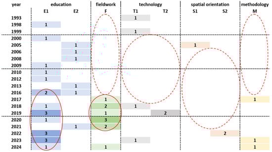 A total of thirty-five works were analyzed in our systematic review and published in twenty-two peer-reviewed journals and two peer-reviewed conference proceedings, of which seven (six peer-reviewed journals and one conference proceeding) were published in more than one of the reviewed papers (Table 2). The scope of the journals is predominantly education, computer sciences, and geography. In addition to these, nine conference papers and three doctoral dissertations are included in our present review.